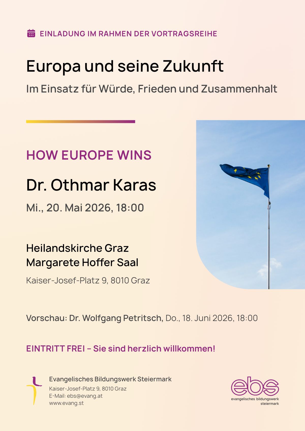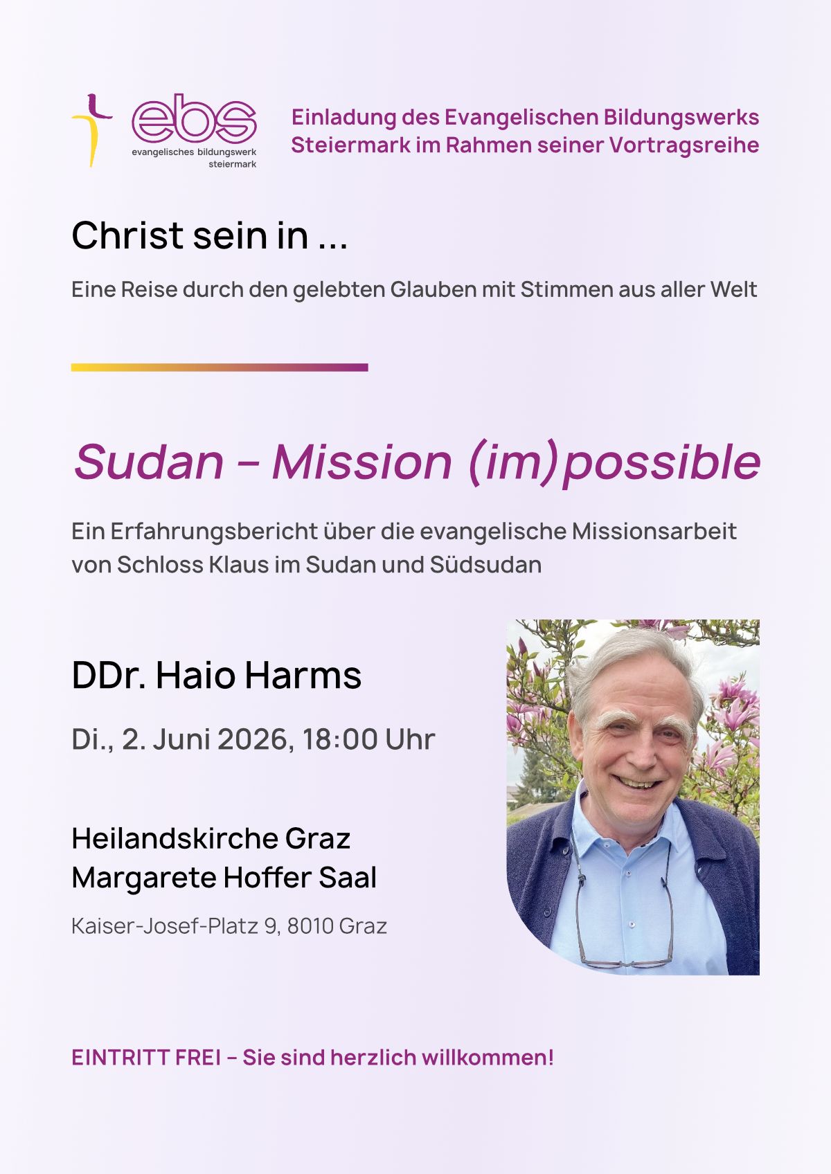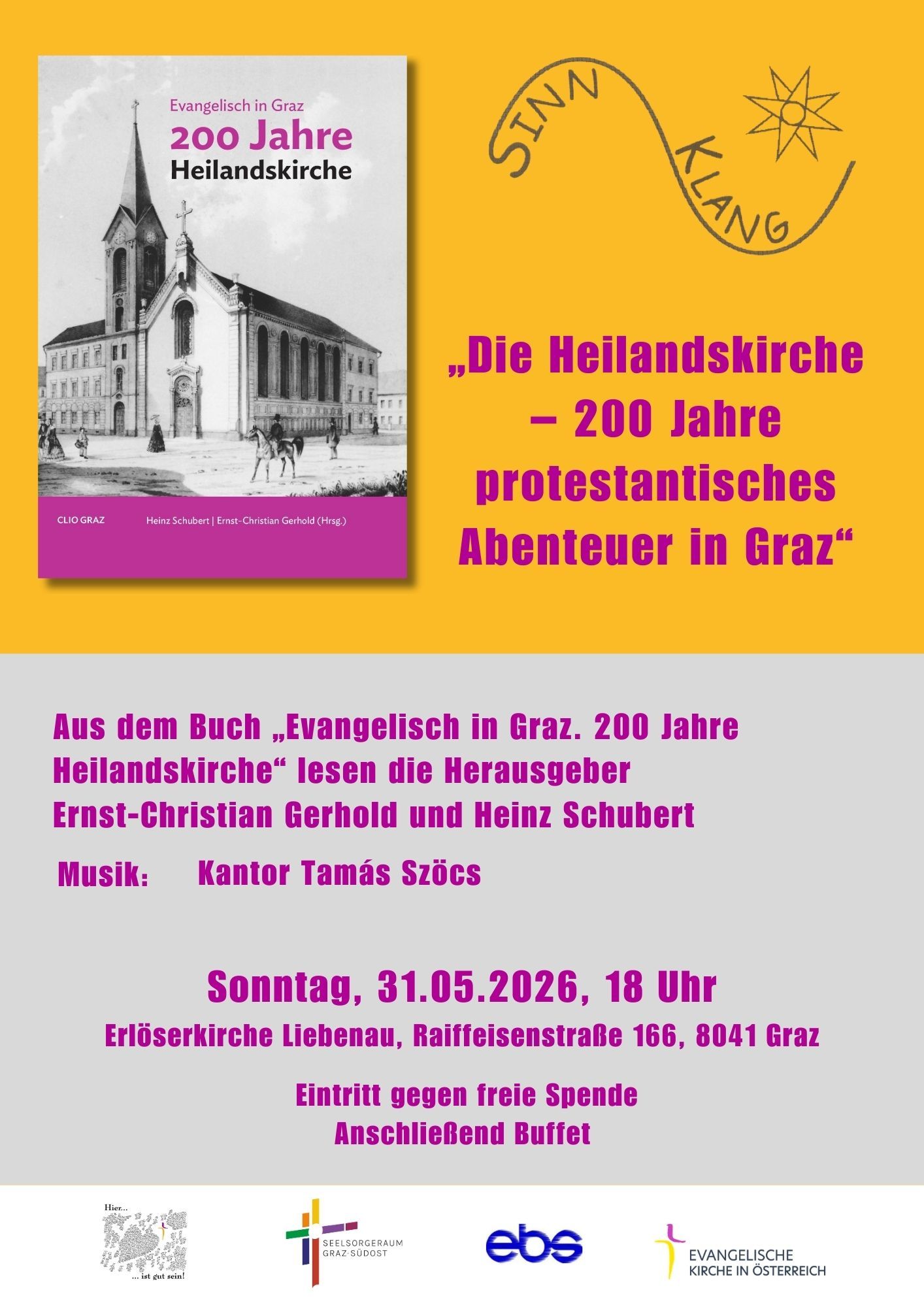 Das nächste Sinn und Klang ist am 31.5.: Die Heilandskirche – 200 Jahre protestantisches Abenteuer in GrazTrinitatis, 31.5.2026, 18 Uhr, Aus dem Buch „Evangelisch in Graz. 200 Jahre Heilandskirche“ lesen die Herausgeber Ernst-Christian Gerhold und Heinz Schubert. Musik Kantor Tamás Szöcs. Eintritt frei, Spende erbeten. Mehr Informationen zu diesem Termin evang-liebenau.at/ek/sinn-und-klang/ Mehr Informationen auf evang-liebenau.at/ek/sinn-und-klang/ (Voransicht unten) Die weiteren Termine von Sinn & Klang sind: