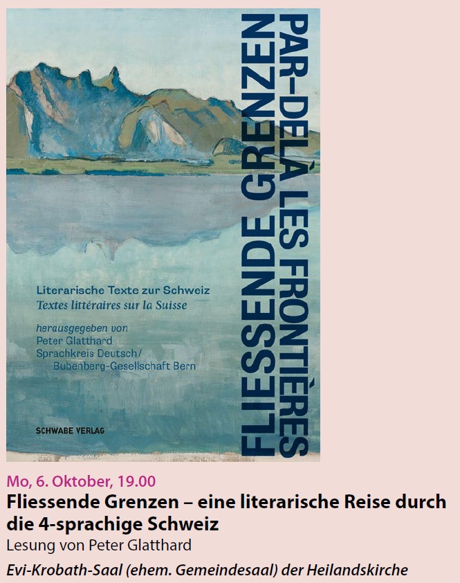 Peter Glatthard studierte Romanistik (Spanisch und Französisch) und war als Übersetzer und Redaktor des Schweizer Parlamentes tätig. Um die Kenntnis der Schweizer Literaturen und den Austausch zwischen den Sprachregionen zu fördern, arbeitet er seit 2016, z. T. mit eigenen Übersetzungen, an der Textsammlung «Fliessende Grenzen». Entstanden ist ein Leseband, der viel aussagt über das Leben von Schweizerinnen und Schweizern in den vier Sprachregionen und dazu anregt, über Grenzen und ihre Überwindung nachzudenken. Jeweils in Original und deutscher Übersetzung ist Prosa und Lyrik enthalten von Huldrych Zwingli, Henri Dunant, Blaise Cendrars, Conrad Ferdinand Meyer und vielen anderen.